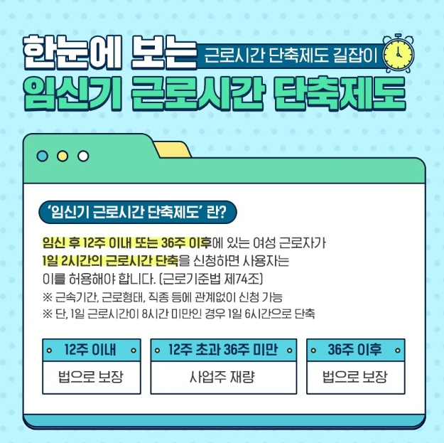 임신 후 12주 이내, 32주 이후에는 한 달 동안 법정기간(임신 후 12주 이내 또는 32주 이후) 하루 2시간씩 단축하여 근무해도 임금 감소 없이 월 급여를 받을 수 있습니다.