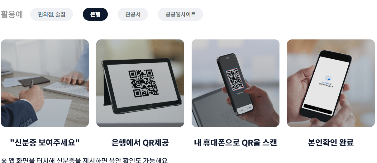 공공기관에서 민원처리 시, 은행에서 금융업무에 신분증이 필요할 때 편의점, 무인자판기 등에서 성인확인 필요시, 온라인(정부 24 등)에서 신원확인, 앱으로 렌터카와 킥보드 대여 시 면허확인 등 신분증이 필요한 모든 곳에서 편리하게 사용할 수 있어요.