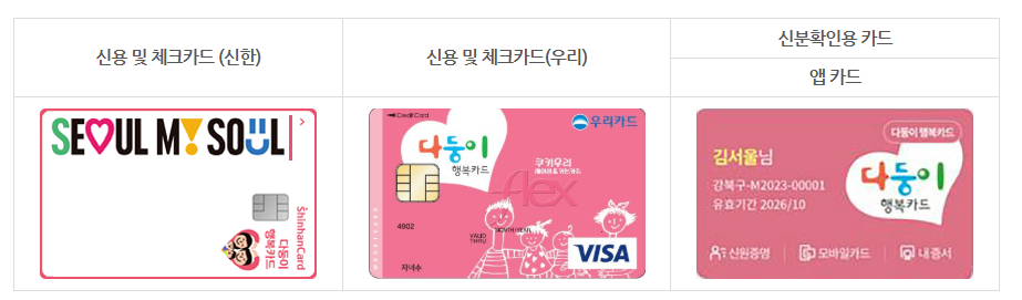 - 서울시: 전용 앱으로 신청 가능. 1,000여 곳 제휴처 할인.