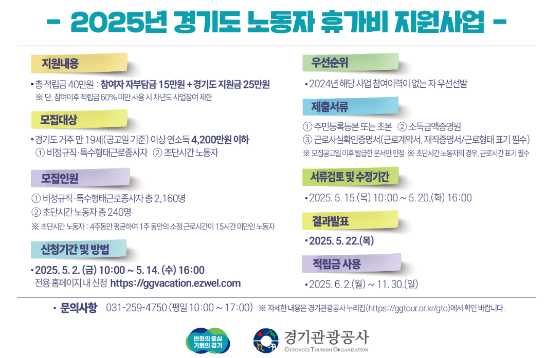 2025년 경기도 노동자 휴가비 지원사업 참여자 모집공고 경기도와 경기관광공사는 비정규직·특수형태근로종사자·초단시간 노동자를 대상으로 관광향유 기회 확대 및 여가환경 개선을 위한 경