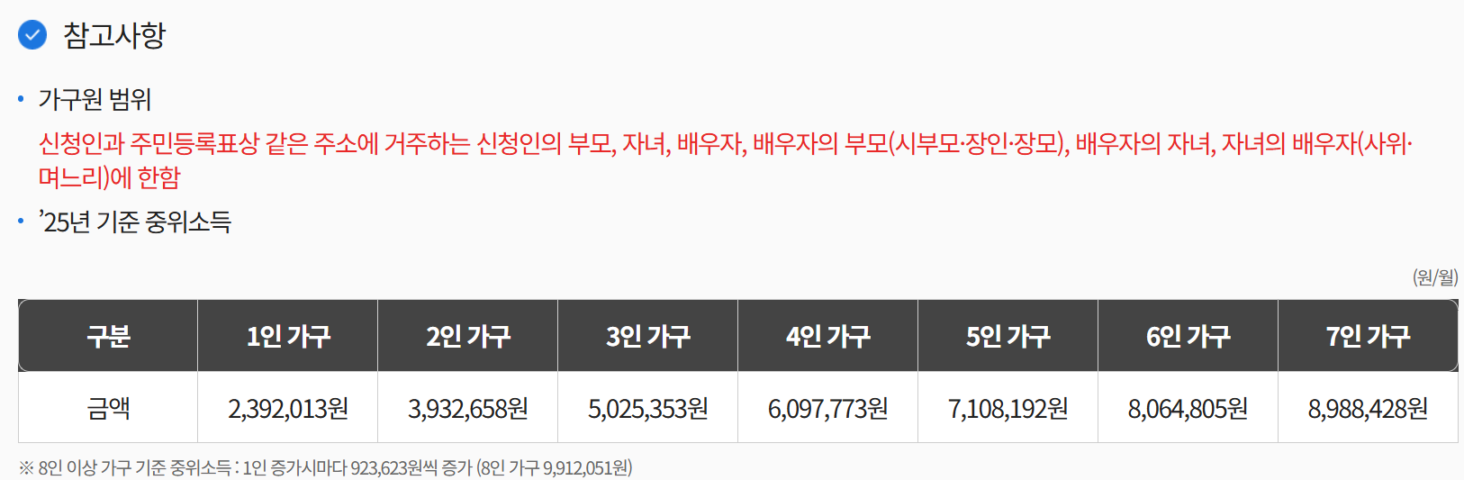 소득 및 재산 기준 충족: 가구의 소득이 기준 중위소득 100% 이하이고, 일반재산(토지, 건축물, 주택, 임차보증금 등) 합계가 3억 5천만 원 이하