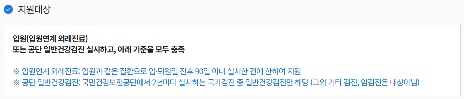 입원 및 입원 연계 외래진료: 퇴원일로부터 180일 이내 공단 일반건강검진: 검진일로부터 180일 이내