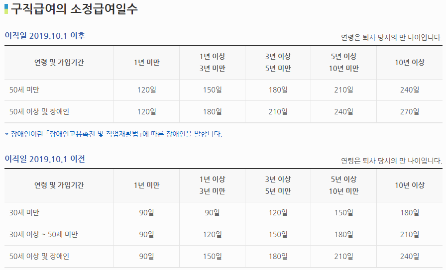 (이직일이 2019.10.1 이전은 퇴직 전 평균임금의 50% × 소정급여일수)